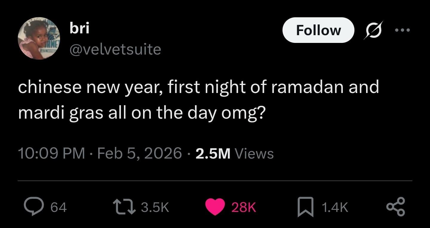 Puzzleheaded-Ad-9280 on February 8, 2026 4:40 am if there exists even a single muslim blasian person of chinese descent living in new orleans, i am very excited for them