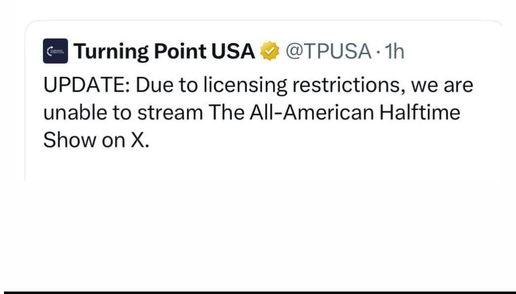dusto_man on February 9, 2026 1:47 am Oh wow…. Don’t even bother to get streaming rights. Half assed failure…guess I’ll watch Bad Bunny instead.