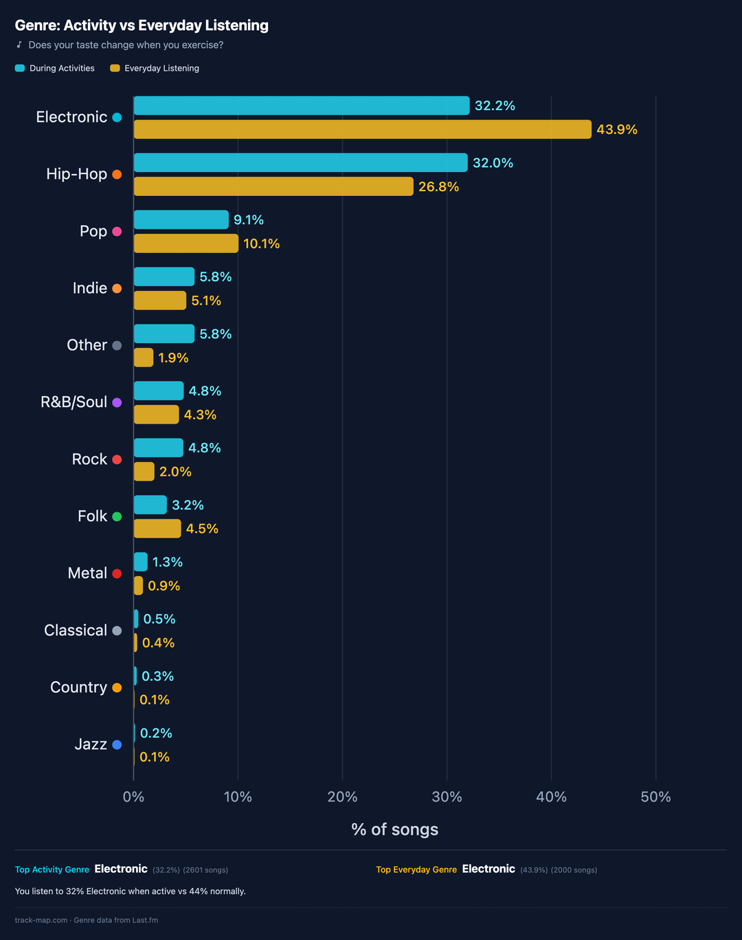 * **My taste shifts when I run.** Hip-hop jumps from 27% of my everyday listening to 32% during activities, while electronic drops from 44% to 32%. I reach for hip-hop to run to, even though electronic dominates the rest of my day.