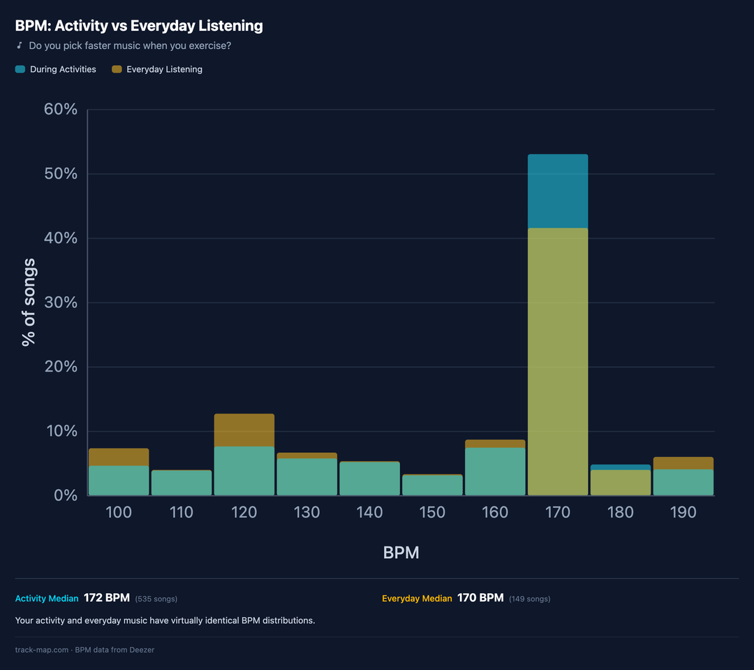 * **My running BPM is virtually identical to my everyday listening:** median of 172 vs 170. I expected to gravitate toward faster tempos when running, but apparently I just like fast music all the time.