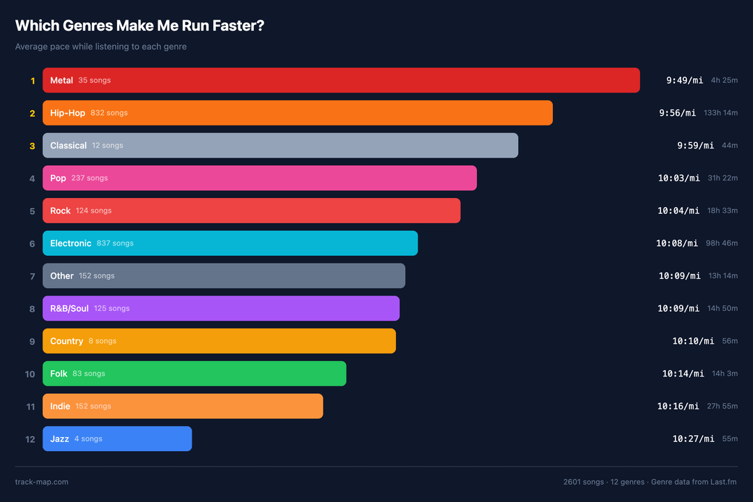 * **Metal and hip-hop are my fastest genres** (~9:49–9:56/mi); indie, folk, and jazz are the slowest (~10:16–10:27/mi)