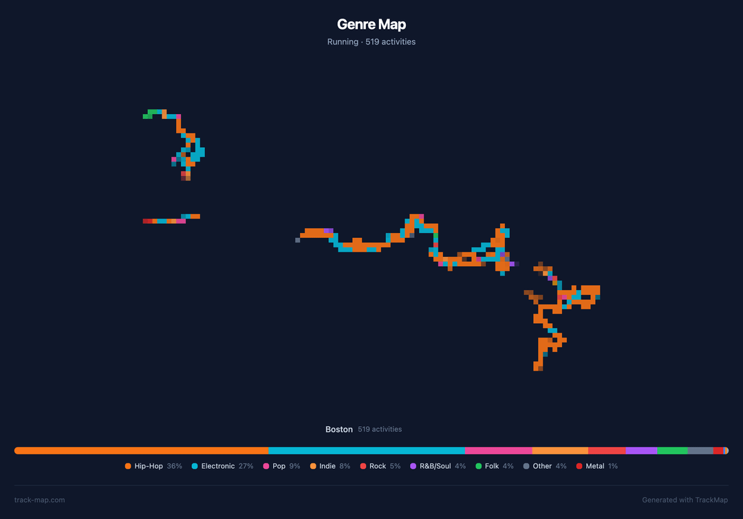 The “Genre Map” (first image) divides my running routes into a grid where each cell is colored by the dominant genre listened to in that area. Opacity scales logarithmically based on how many runs passed through each cell. The map shown is Boston, where the majority of my runs took place. You can see the hip-hop orange and electronic teal trading off across different routes.