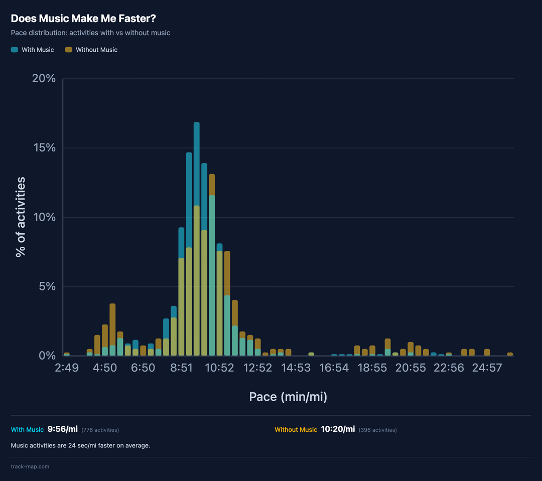 * **Runs with music average 9:56/mi vs 10:20/mi without.** Roughly a 24 sec/mi difference across 776 vs 396 activities
