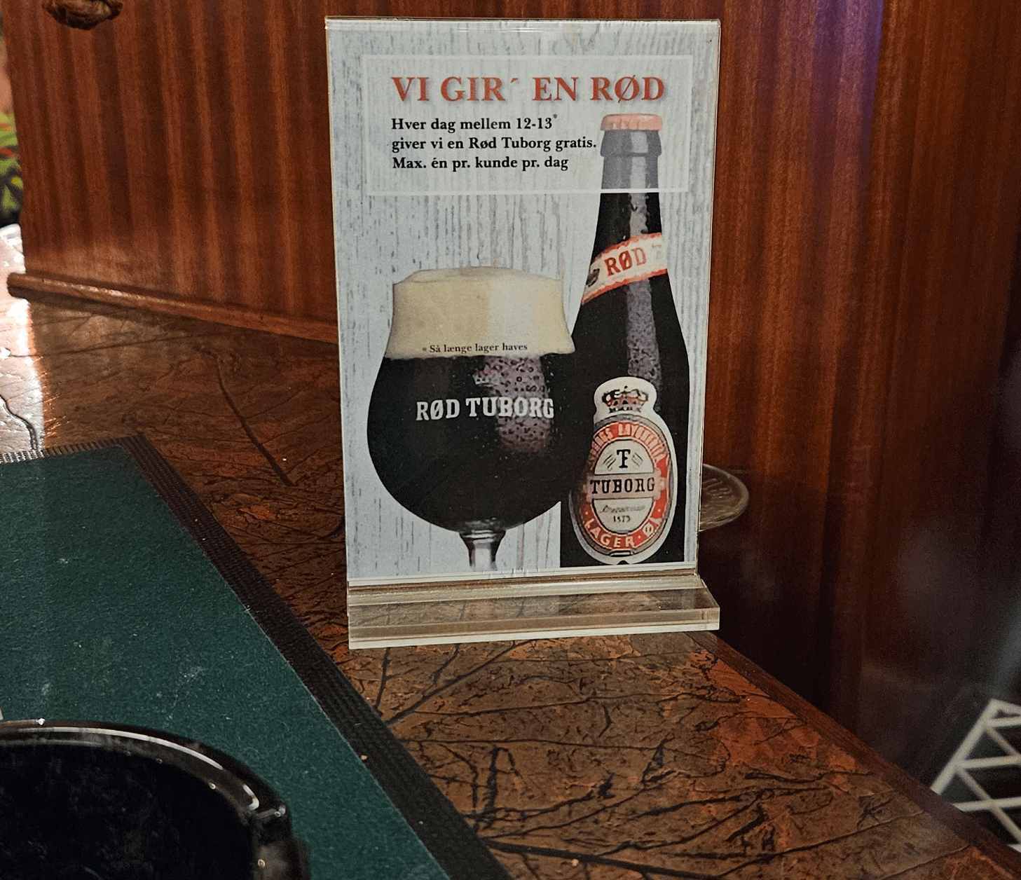 > Every day between 12-13, we’ll give you a free Tuborg Red. Max 1 per day”