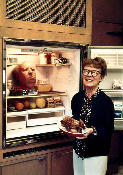 Alma Reville with the prop head of her husband, Alfred Hitchcock, 1972.