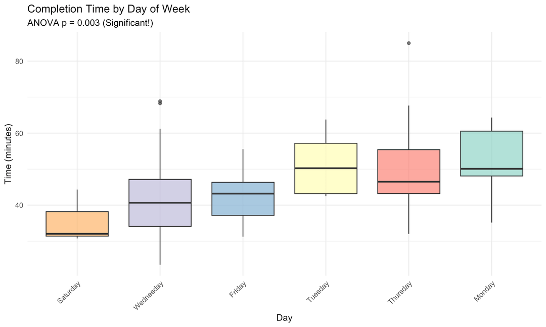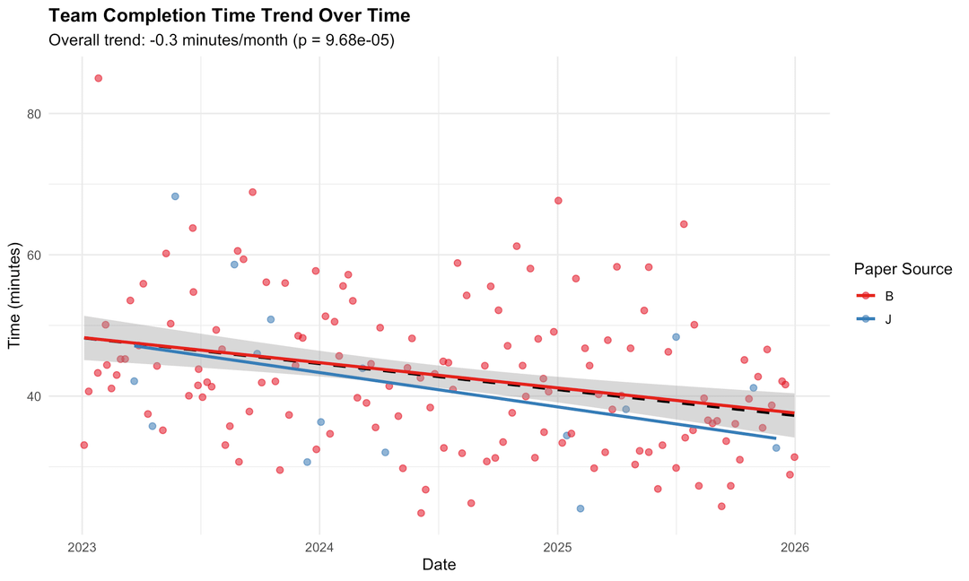 Then I had a silly idea: what if we timed ourselves every week and tracked it? At first it was just for fun. We documented dates, completion times, and a few notes about the puzzle. We ran some basic stats (mean, median, standard deviation) and made a simple graph.