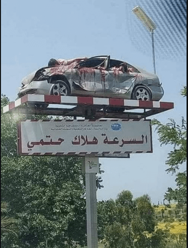 The Arabic text “السرعة هلاك حتمي” translates to “Speeding is inevitable destruction.” this billboard have actually been quite controversial locally; while some think the bluntness could save lives, others argue that making billboards this graphic actually distracts drivers from the road, potentially causing the very accidents they’re trying to prevent.