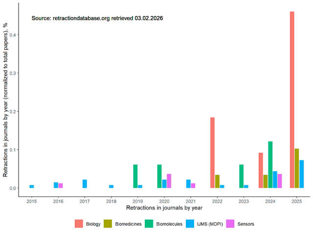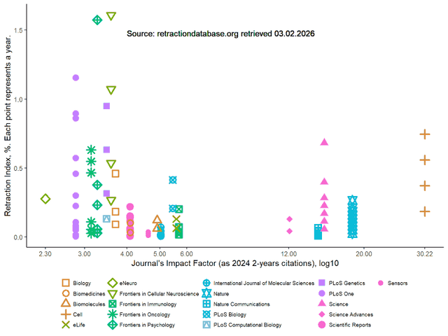 * Absolute retractions numbers are not informative, as journals varies by total papers published on the degree of one order. So, I used Index of Retraction (IR), calculated as Retractions per year/Total papers published in 2024 (as most recent open data).