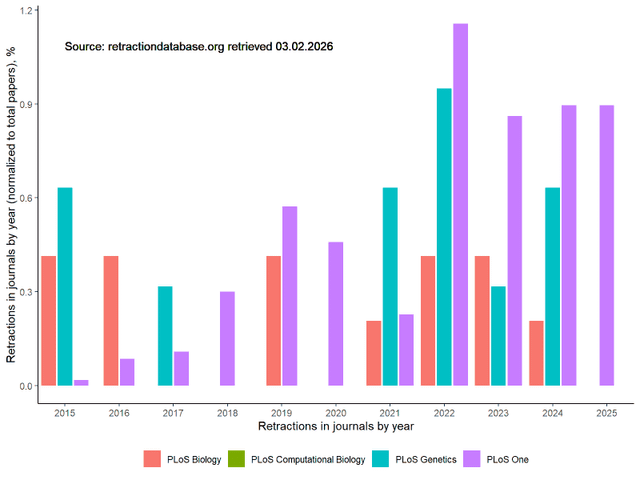 * Total retractions per year is around 1% of total published papers for all journals – that is low, in contrast to numbers, voiced by science critics-alarmists. But again, IR is underrepresenting the total degree of scientific misconduct in modern science.