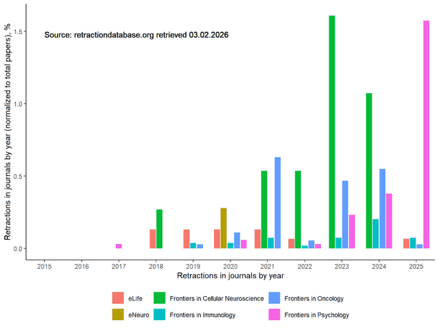Retractions is one of metrics of scientific fraud or misconduct, but must be taken with caution. The process of retraction is nontransparent, depends on retraction politics of journal/publisher. It may take years – eg. famous "arsenic life" paper was retracted 15 years after publication, and gliphosate fraud paper was retracted 25 years after publication. There a lot of cries in academic community about "predatory" OA publishers, like MDPI and Frontiers, so I plot the retractions by these journals and NSC (Nature, Science, Cell) top journals and their OA daughter journals.