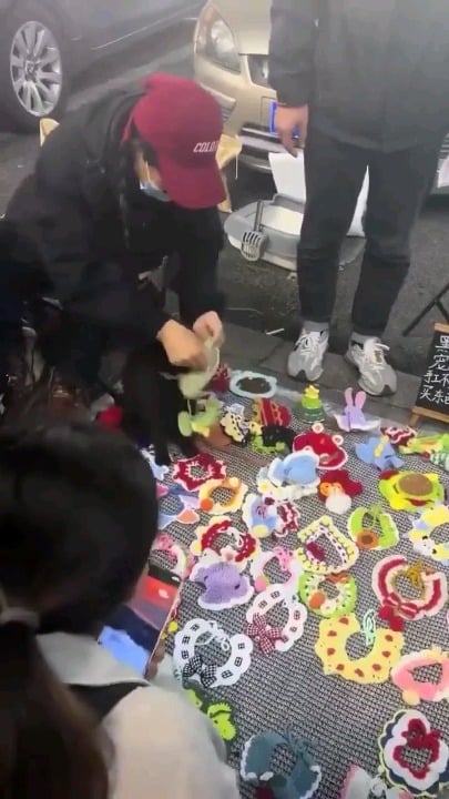 An elderly woman makes cat accessories and uses her black cat as a model to sell them.