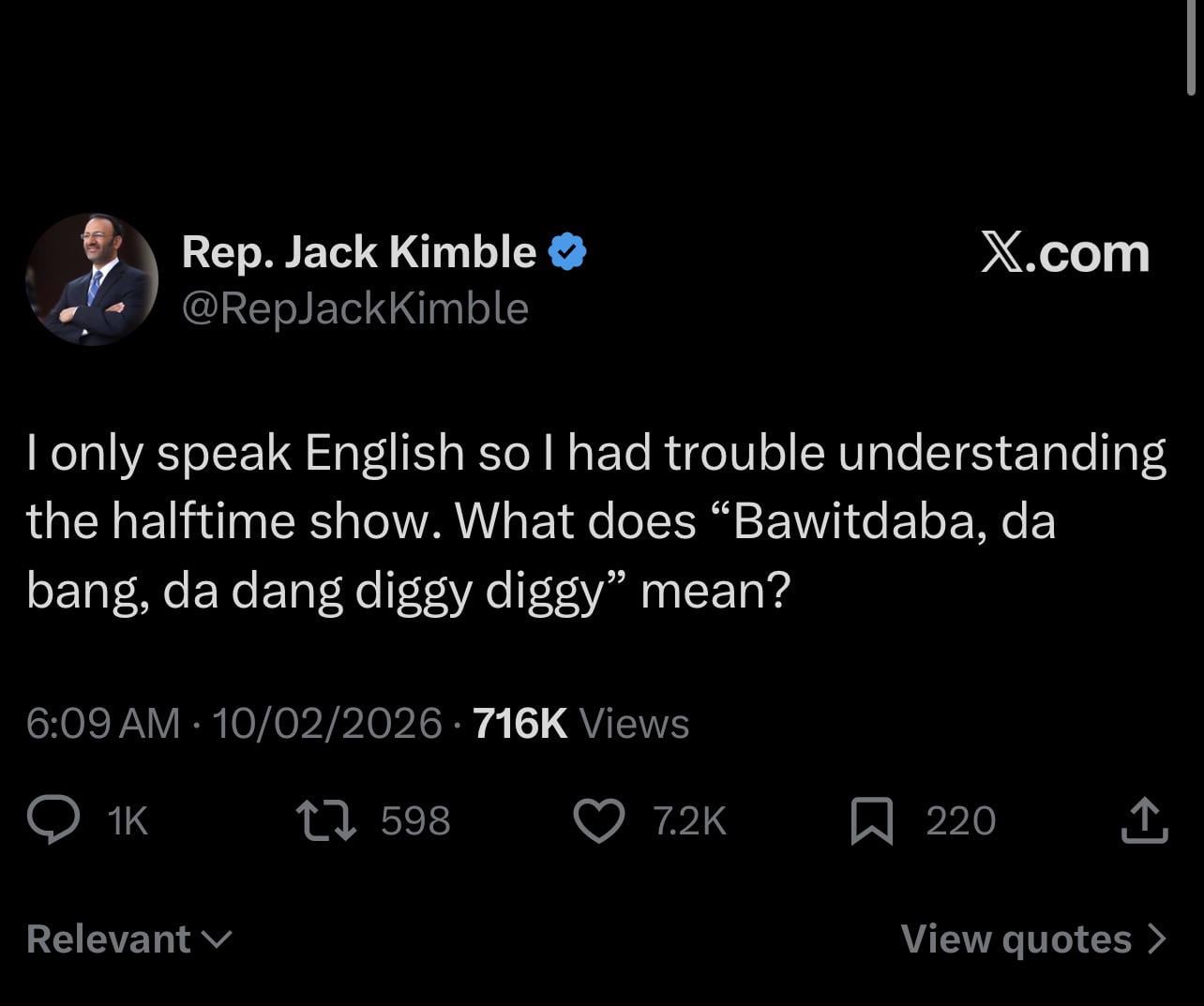 The person is referring to Kidd Rock’s performance not BadBunny. Also parody account.