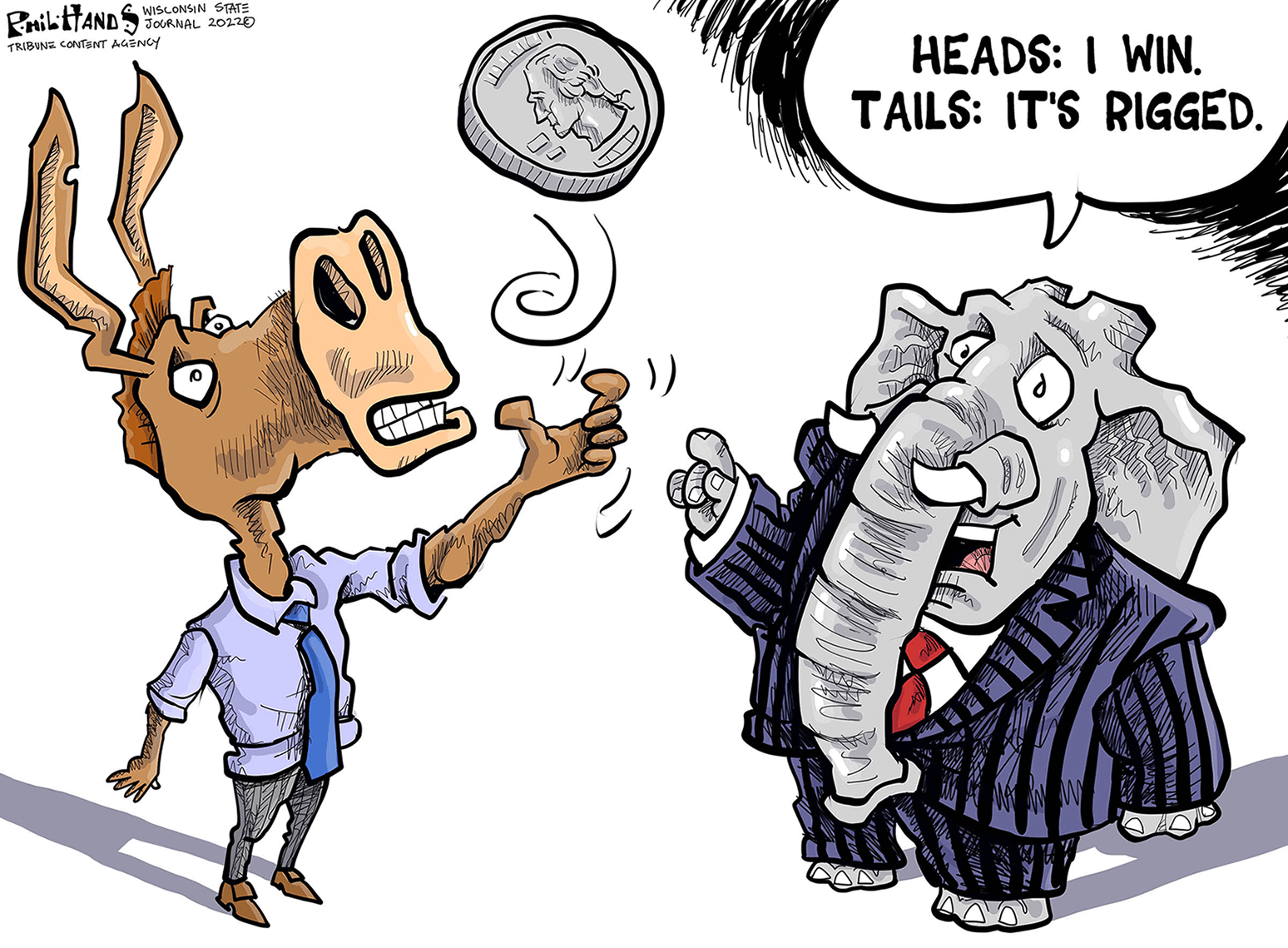 2. Upon winning, donkey negotiates down to flipping a dime and letting elephant decide which side it landed on.