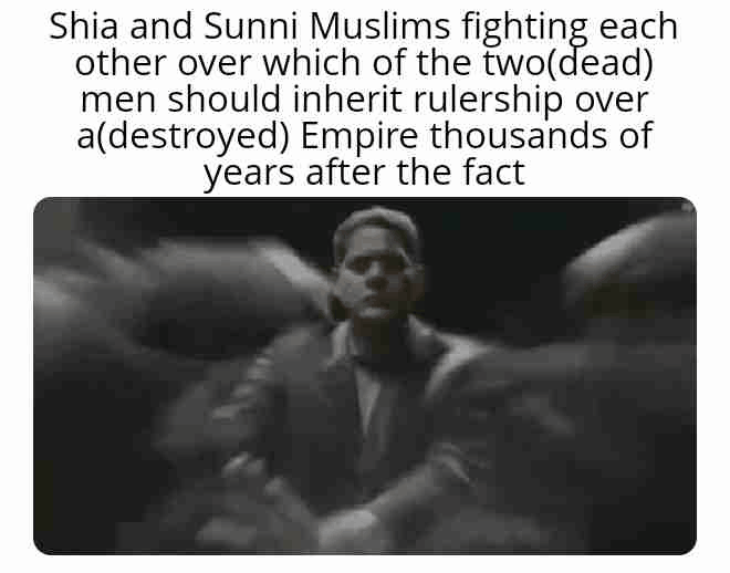 As a Muslim, I’m glad to finally see a funny meme about Islamic history. But to be honest though, every Sunni Muslim loves Ali and still considers him one of the coolest figures in Islamic history. It’s just that the Shia take that a step further and put Ali on a colossal pedestal. And fun fact, most Muslim countries in the Middle East still use the term Khawarij to refer to the various terrorist groups that are active in the Muslim world, like ISIS or Al-Qaeda or Al-Shabab or Abu Sayyaf.