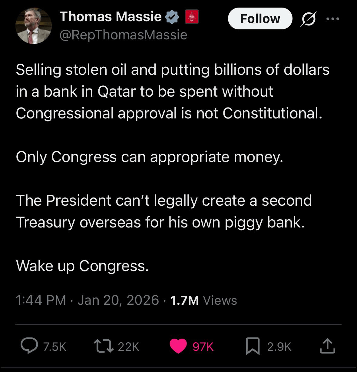 Republican Congressman Thomas Massie says, Trump building a personal treasury in Qatar with the money made from the oil stolen by the US military from Venezuela and Iran.