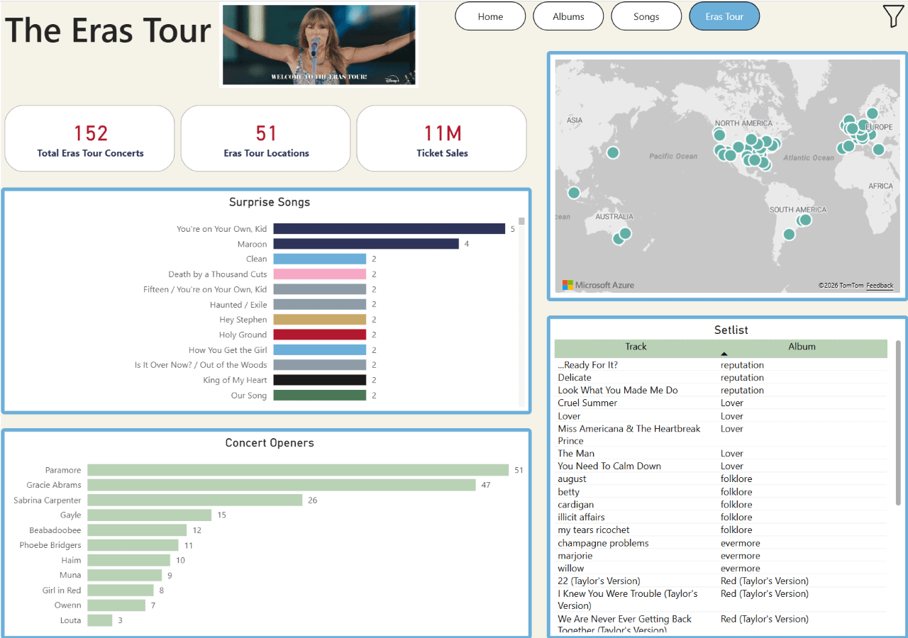 For the Swiftie data nerds – From Debut to Eras Tour: An Interactive Taylor Swift Power BI Dashboard by Billylubanski