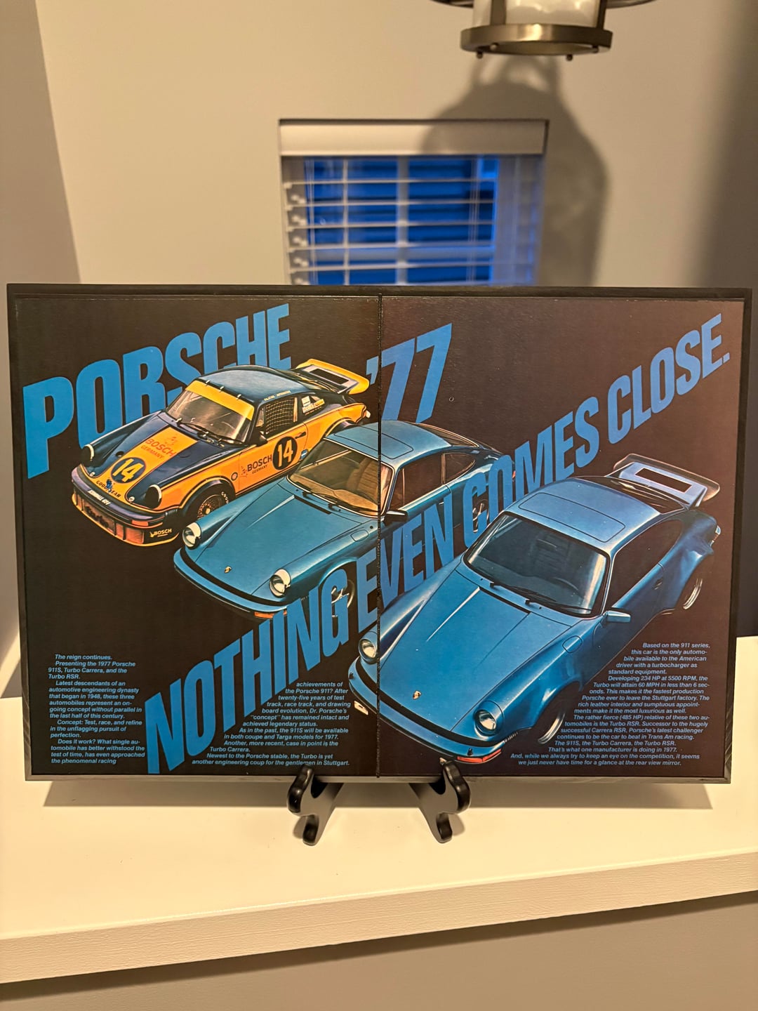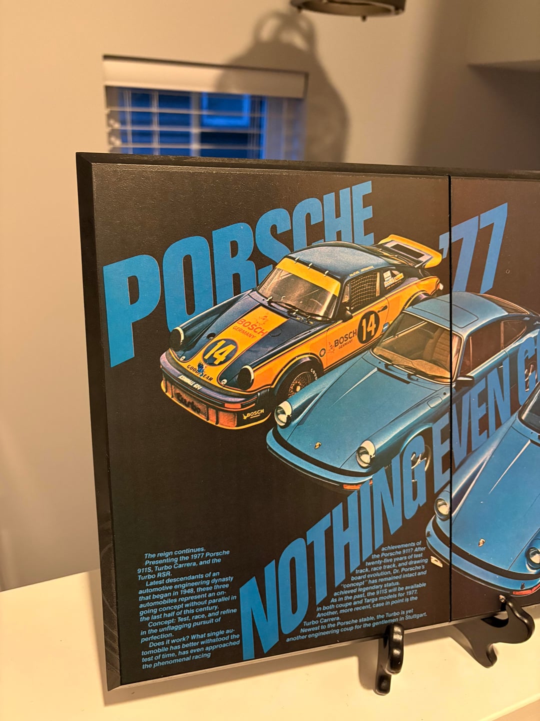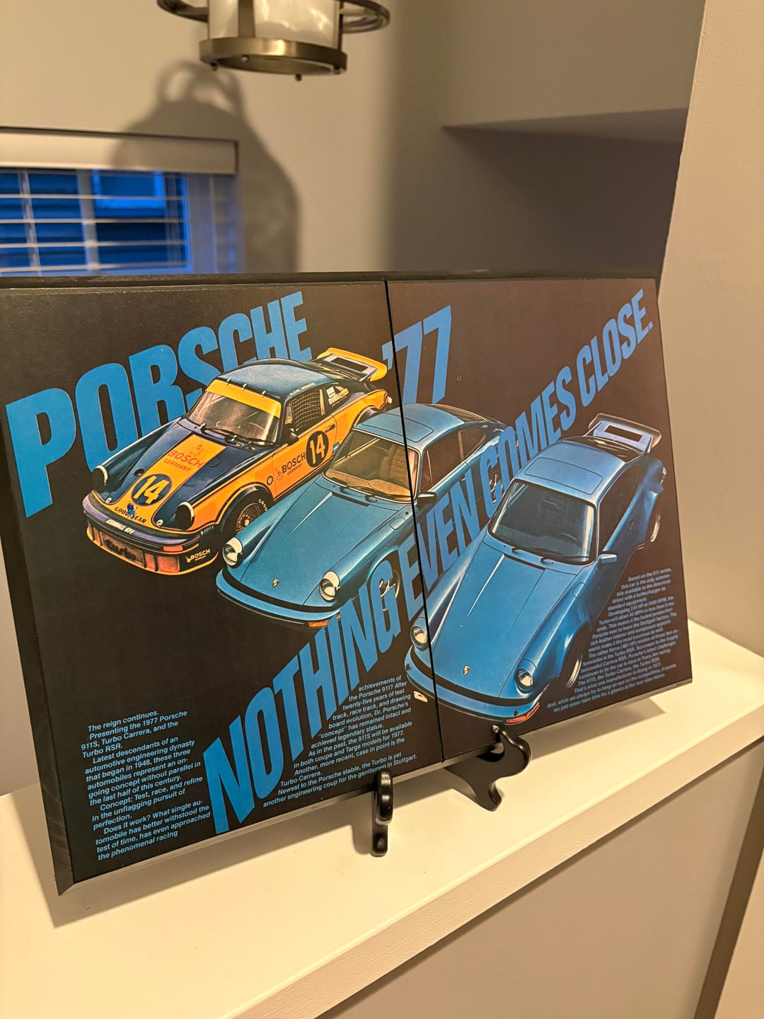 Porsche 911 2-Page Magazine Ad From 1977 Preserved on a 3/4 inch Thick Hardwood Plaque