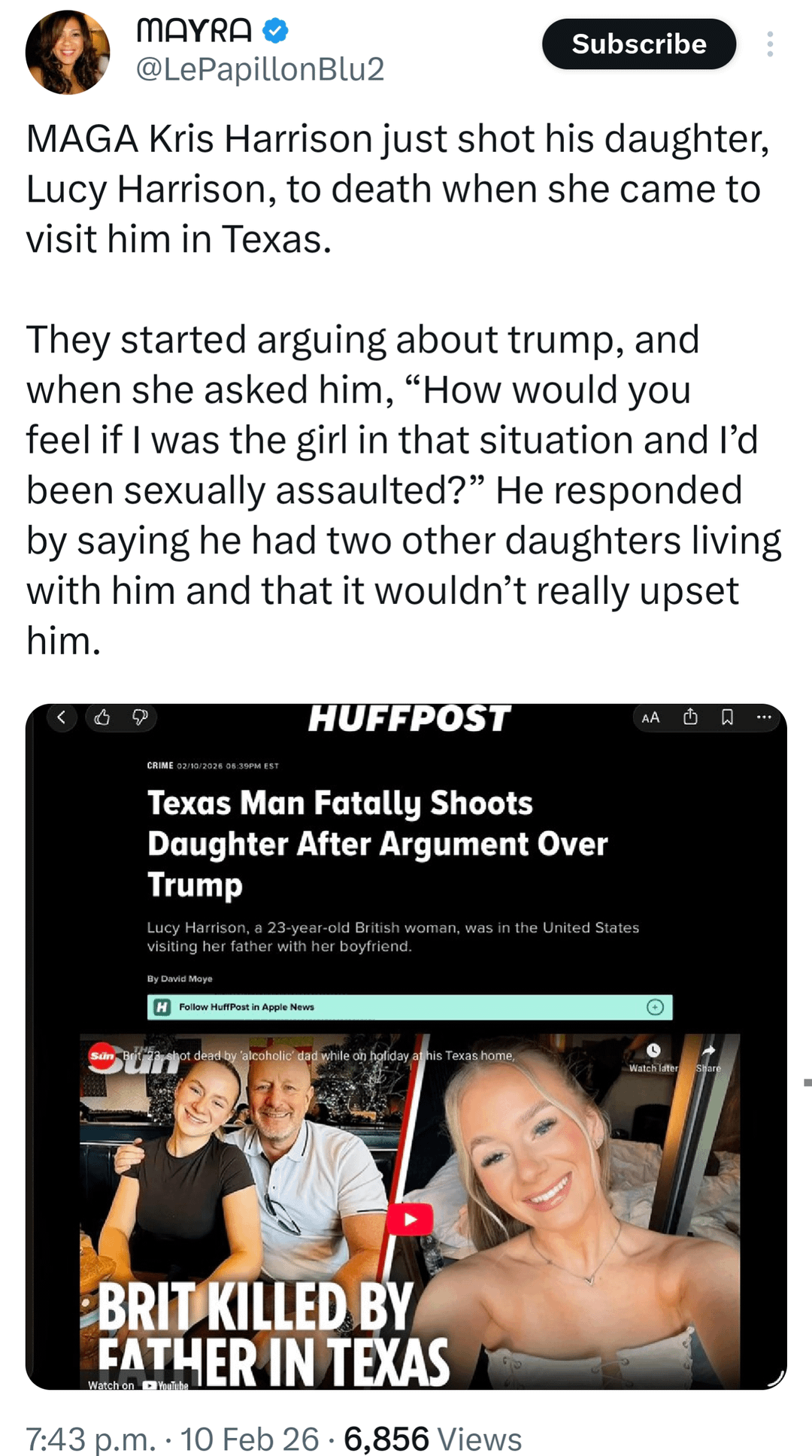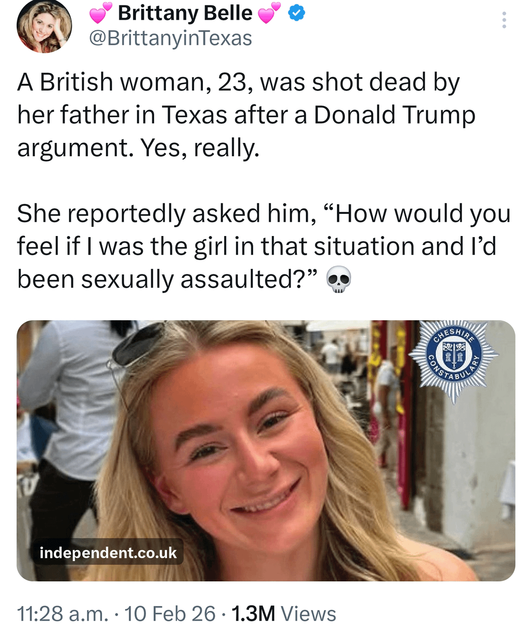 [https://www.thedailybeast.com/british-woman-shot-dead-by-father-after-arguing-about-donald-trump/](https://www.thedailybeast.com/british-woman-shot-dead-by-father-after-arguing-about-donald-trump/)