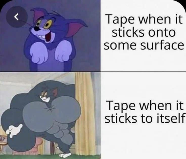 Tape when it touches itself for 0.2 seconds: world’s strongest bond known to man 😭