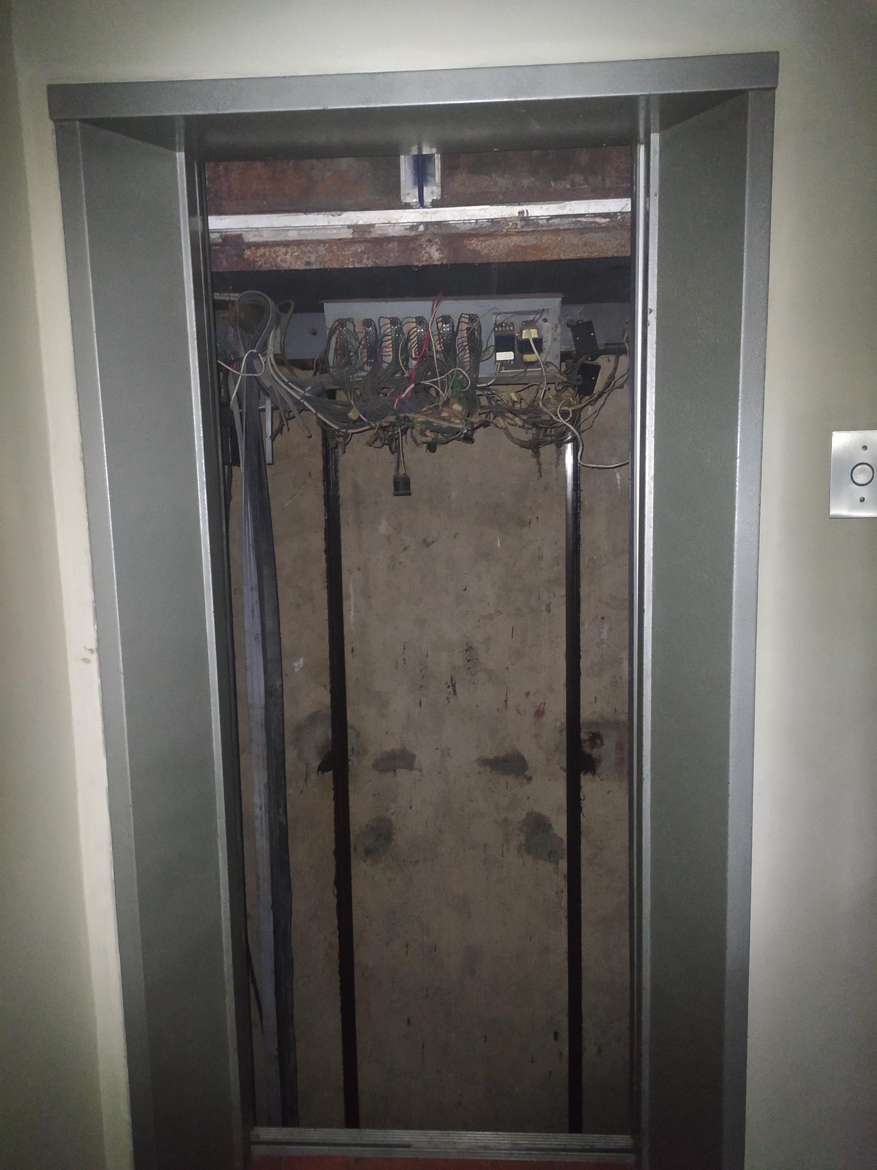 This photo was taken in a closed-down and/or condemned structure. That elevator has probably been where it is for years.