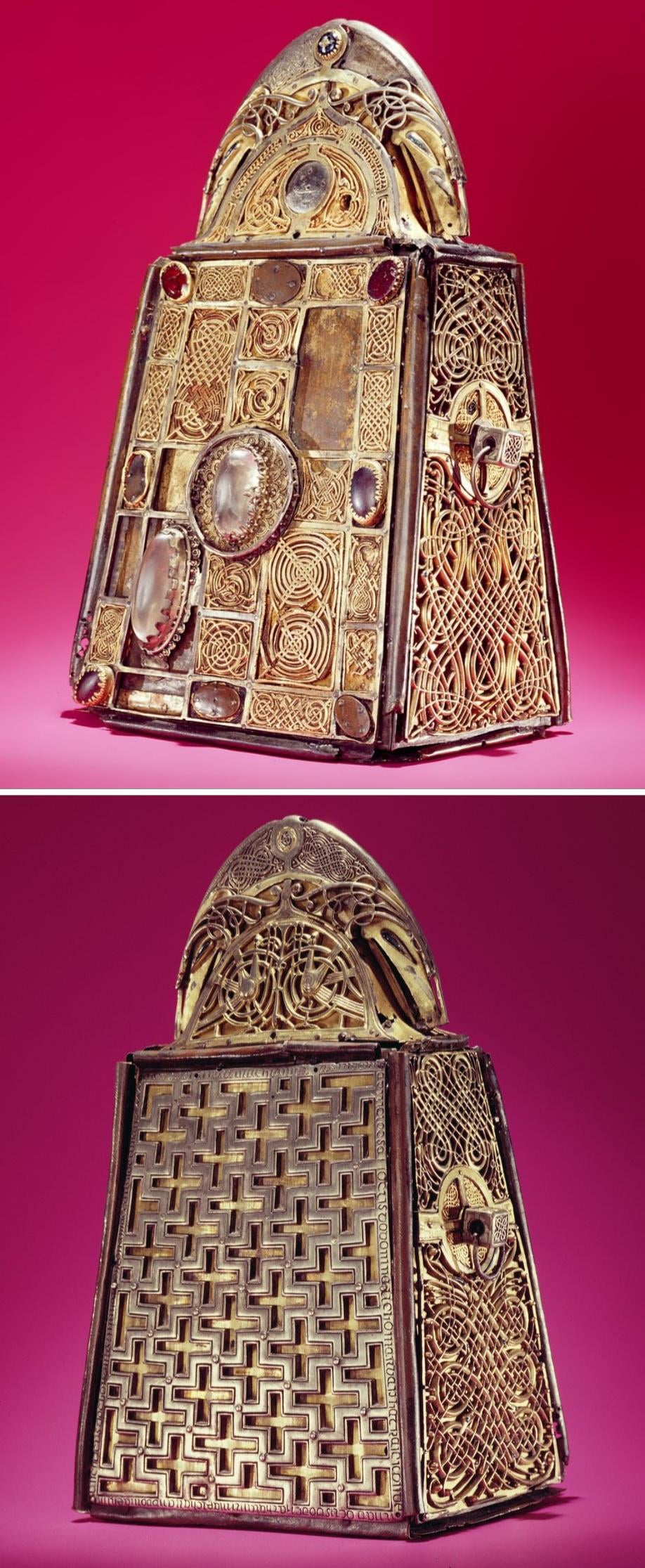 The Shrine of St. Patrick’s Bell is a bell shrine reliquary dated to c. 1094–1105 CE, and is made of bronze, silver, gold, glass and rock crystal. It contains a c. 500 iron hand-bell which survives, and is a highpoint of Irish metalwork from the late Insular and early Romanesque periods [918×2231]