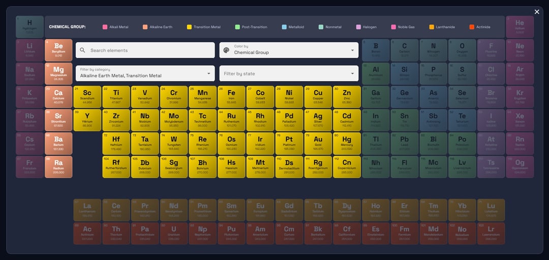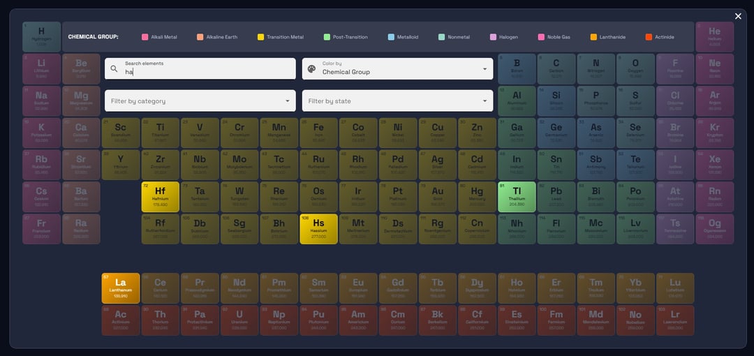 – Real-time search by element name, symbol, or atomic number (debounced for performance)