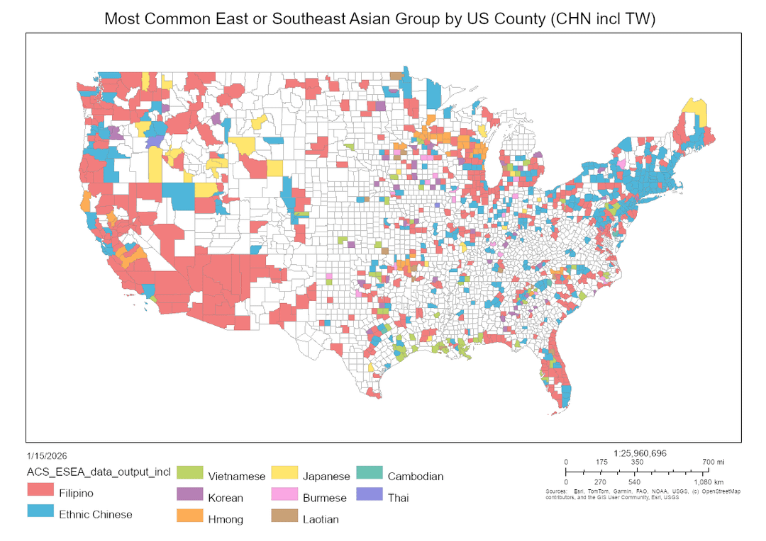 I made a modified version of u/VineMapper's maps of Asian ethnicities in the US where I combined East Asian and Southeast Asian into one category. For some reason Hmong are counted as "East Asian" in the ACS dataset, even though most Hmong Americans came here from Laos in Southeast Asia. I used the exact same data sources as they did in their 2025 posts in r/MapPorn– the 5-year ACS estimates from 2023.