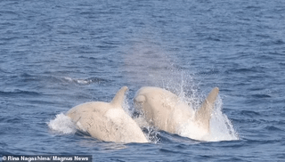 Japanese whale-watchers were stunned to spot two rare albino orcas, covered in battle wounds from the open ocean. Noriyuki Hayakawa captured the images.
