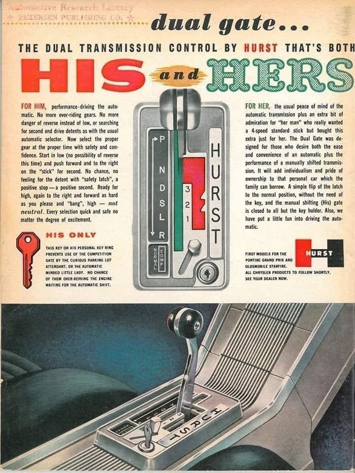 Hurst introduced the iconic dual gate “his and her” shifters 1963.