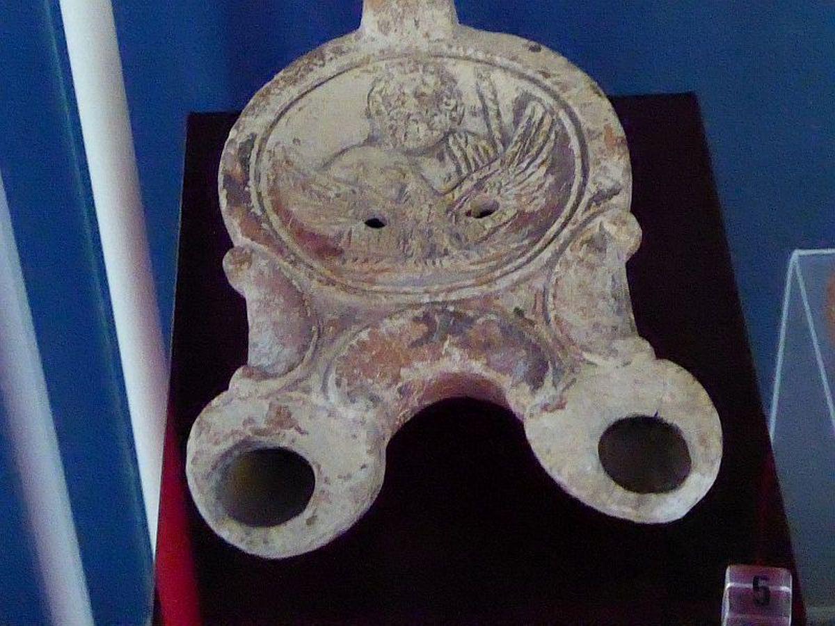 Roman oil lamp with two holes for pouring liquids (so-called bilychnis). The image of Jupiter and the eagle is visible on the object. The object was found in Domus Romana in Malta. [1200×900]