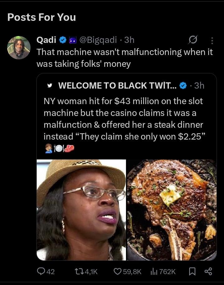 $43 million to a steak dinner? She should get the money the machine said she won.