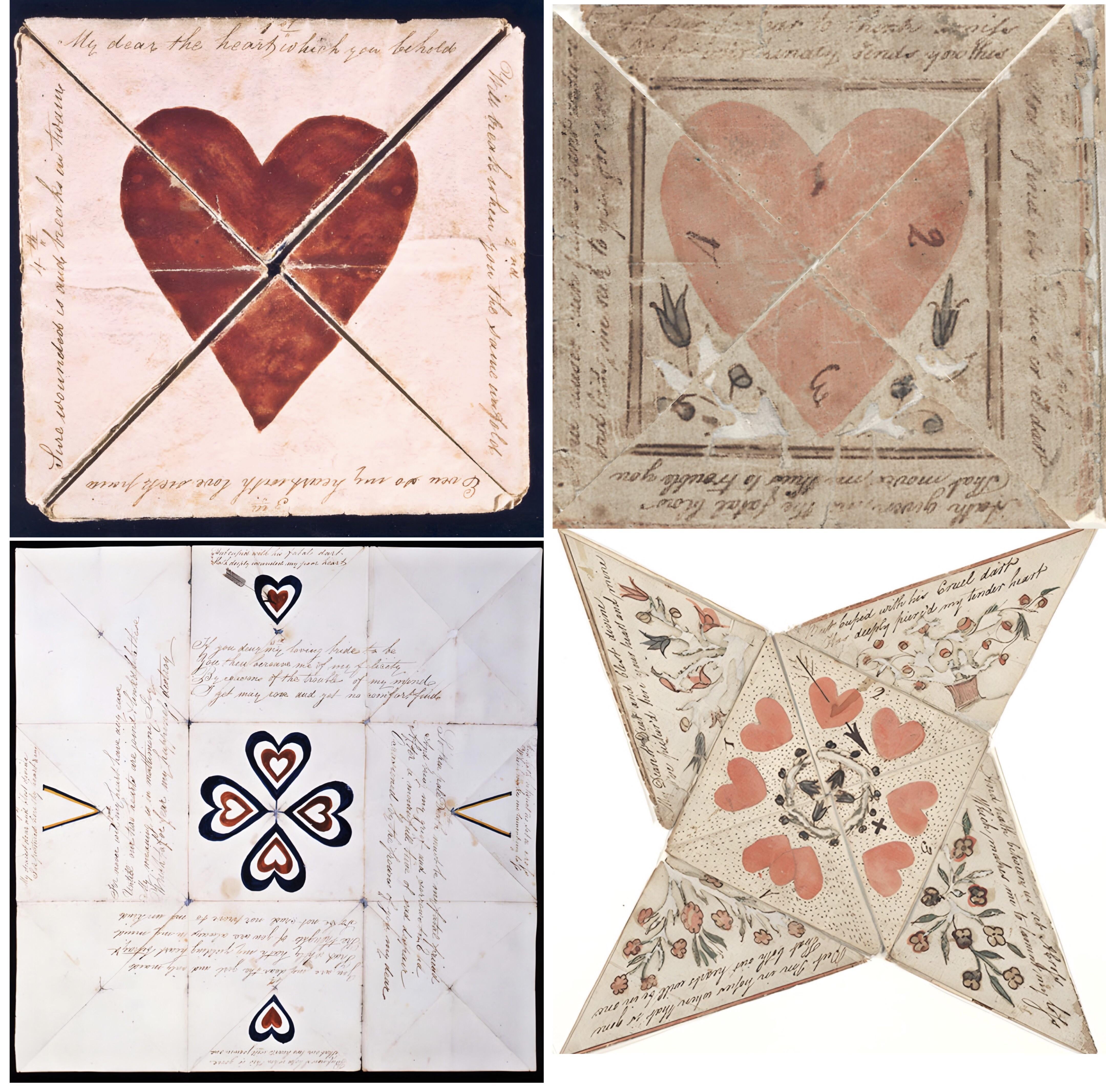 Folded Puzzle Purse Valentine, c. 1800 show a little more clearly the layers of text and image of these folded ‘puzzles’. The front flaps are worn enough to make the verses difficult to make out, but they are definitely different from the first example. The quadrants of the large central heart are numbered to make sure that the verses on the next layer are revealed and read in the correct order. When that heart is ‘broken,’ the next layer revealed looks like a pinwheel.