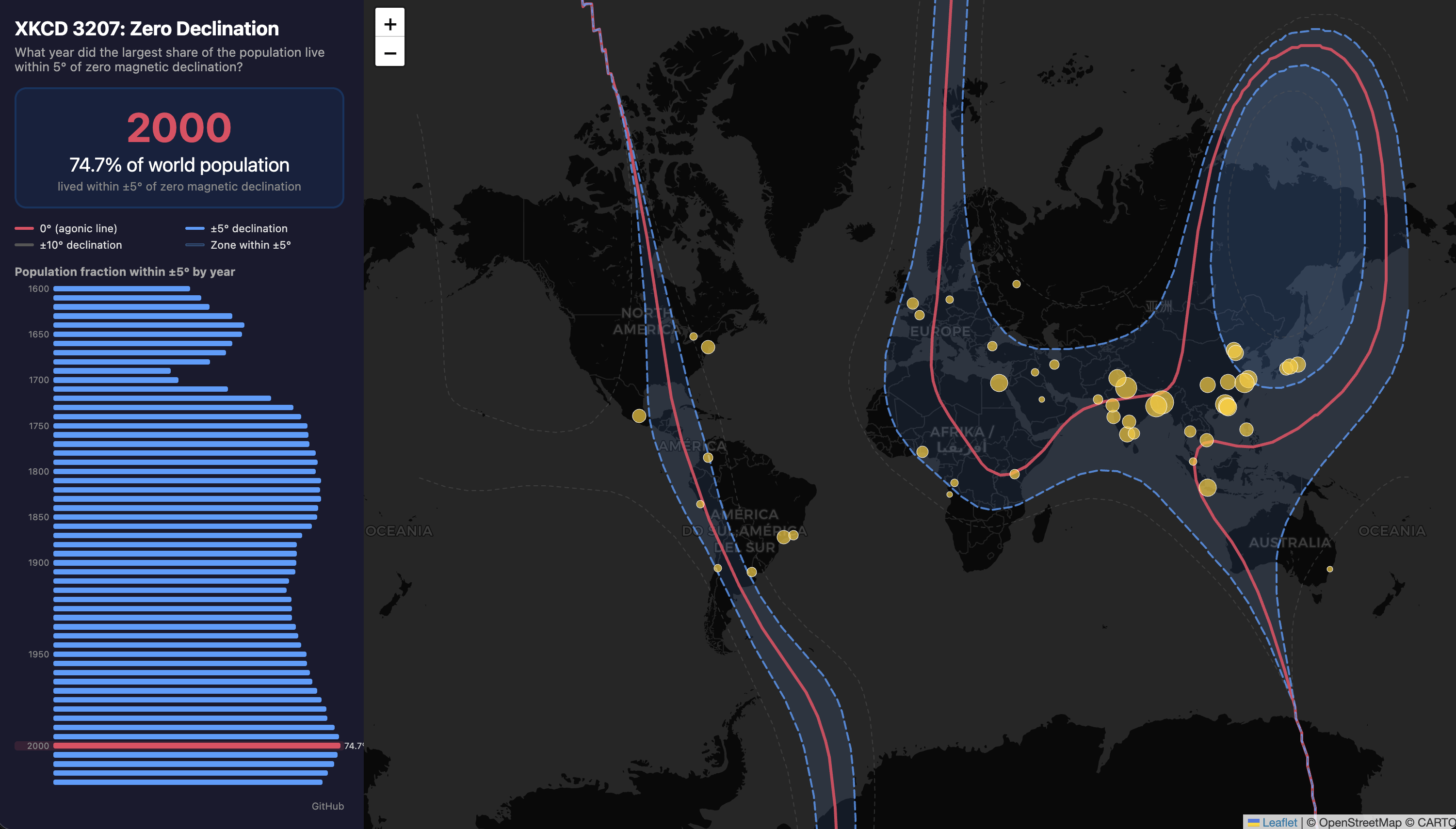 'The zero line in WMM2025 passes through a lot of population centers; I wonder what year the largest share of the population lived in a zone of less than 5° of declination,' he thought, derailing all other tasks for the rest of the day.