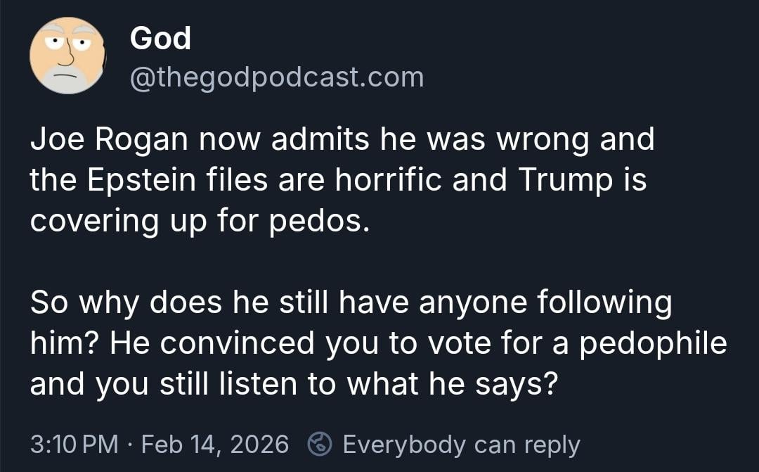 Is he ACTUALLY hinting that he thinks DJ Trump is a pedophile though, or “just” that he’s covering for his pedophile friends?