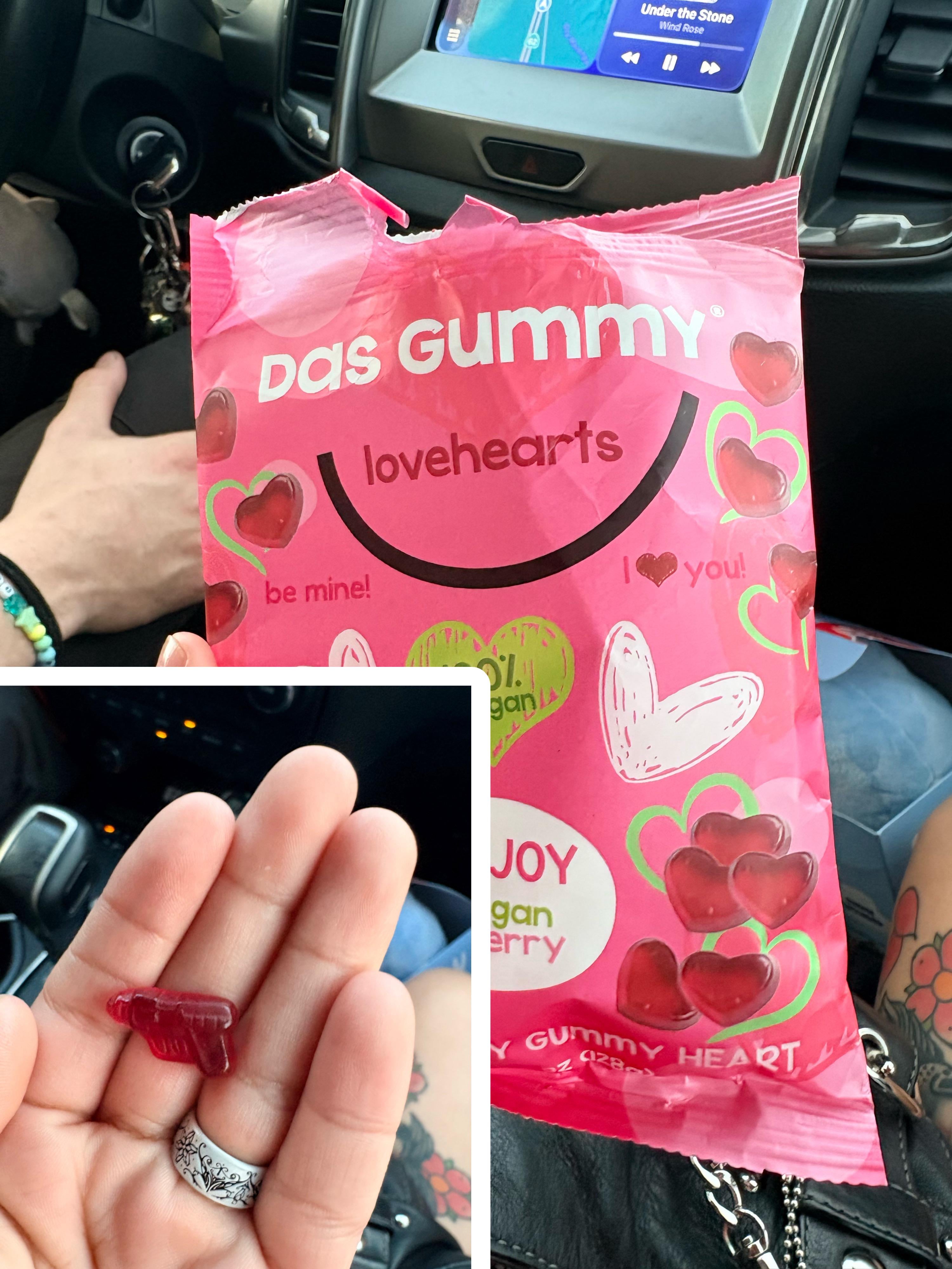 A single gun shaped gummy in my heart shaped gummy bag