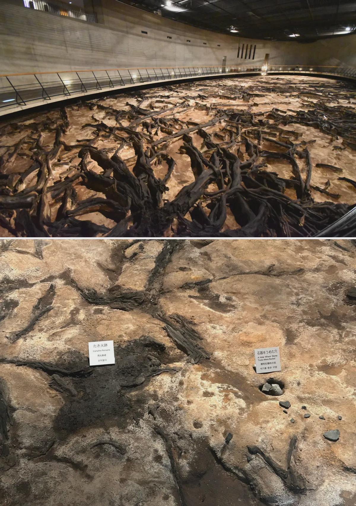 The Sendai City Tomizawa Site Museum, in northern Japan, preserves a fossilized forest, where the remains of human habitation that occurred 20,000 years ago were discovered in 1988. The bottom picture shows a campfire remains and a hole where stone tools were buried [1200×1706]