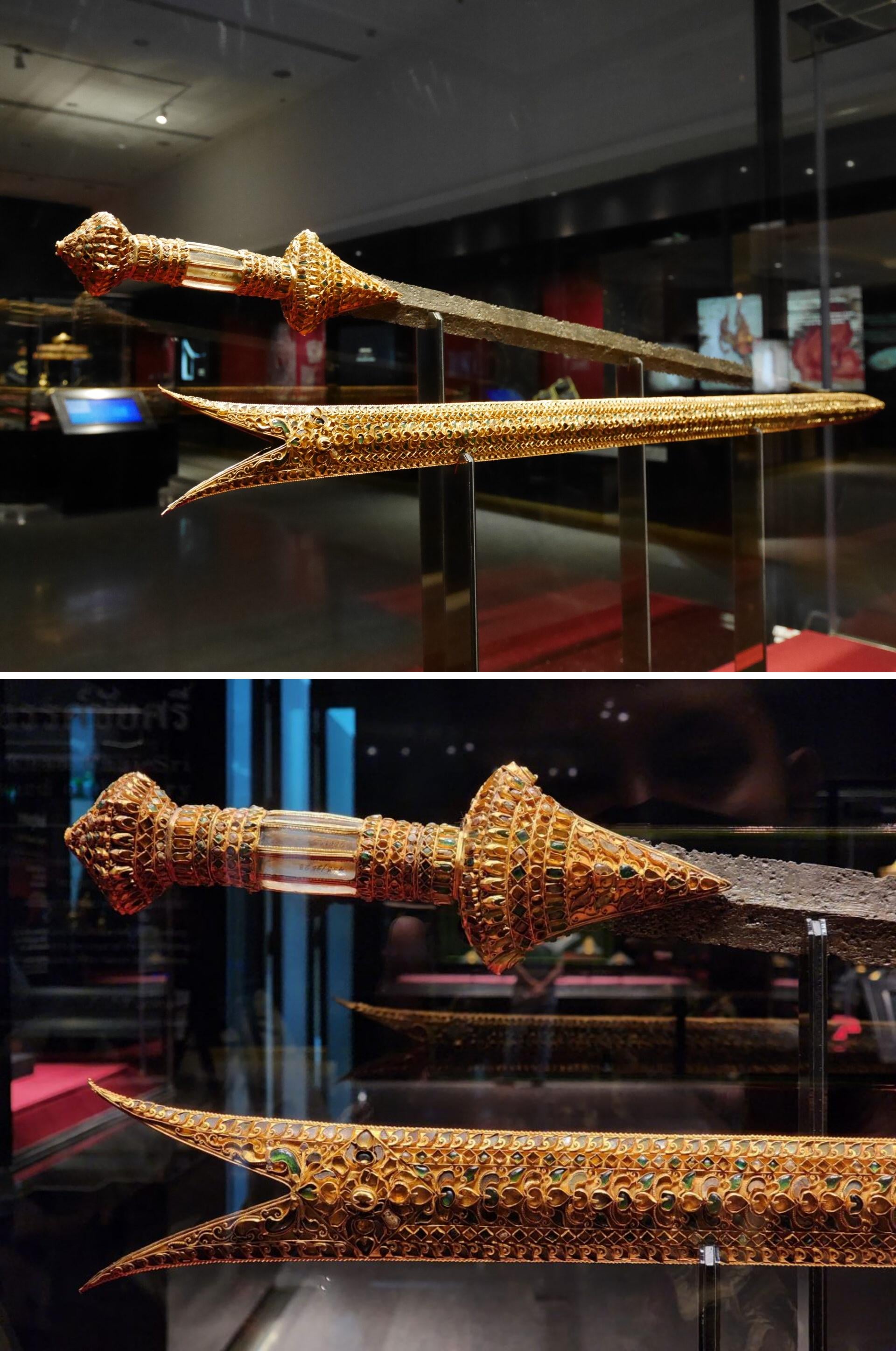 A 115 cm long sword excavated from the crypt of Wat Ratchaburana in Ayutthaya, Thailand. The sword, which probably dates to the reign of King Intharacha (1409-1424 CE), features a double-edged iron blade, a hilt made of gold and quartz crystal, and a golden sheath decorated with gems [1920×2894]
