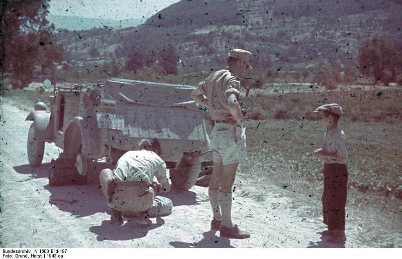 German soldiers talking to a local Sicilian boy as they change a tire on their Kübelwagen. Sicily, Italy (1943) [640×412]
