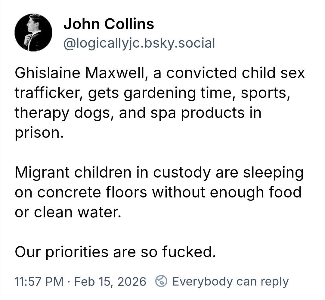 Entropy_dealer on February 16, 2026 2:22 pm It’s not “our” priorities, it’s the priorities of the ruling class who do not give a flock about the poor people