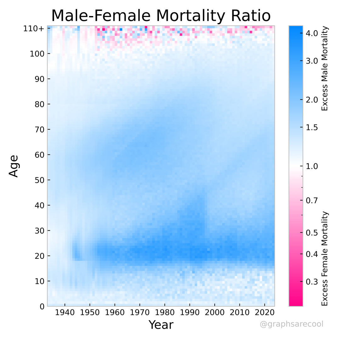 That blue diagonal of excess male mortality of baby boomers (looks like birth years in the 40s-50s) is very interesting that it keeps extending into their old ages