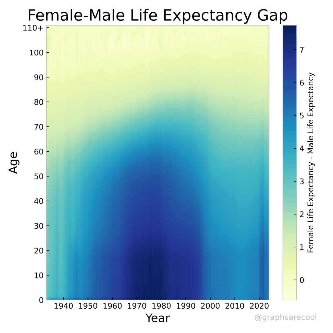 The spike in female – male life expectancy around COVID was the most surprising thing in here to me. Very cool graphs!