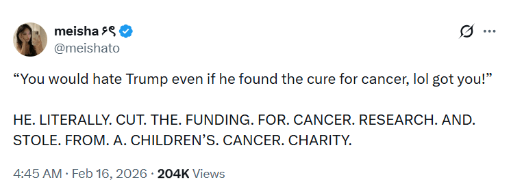 It’s even funnier when you consider if the cure for cancer was discovered during his term, the scientist would almost certainly hate trump, and the orange buffoon would probably try and steal any award and all the credit even though he did absolutely nothing.