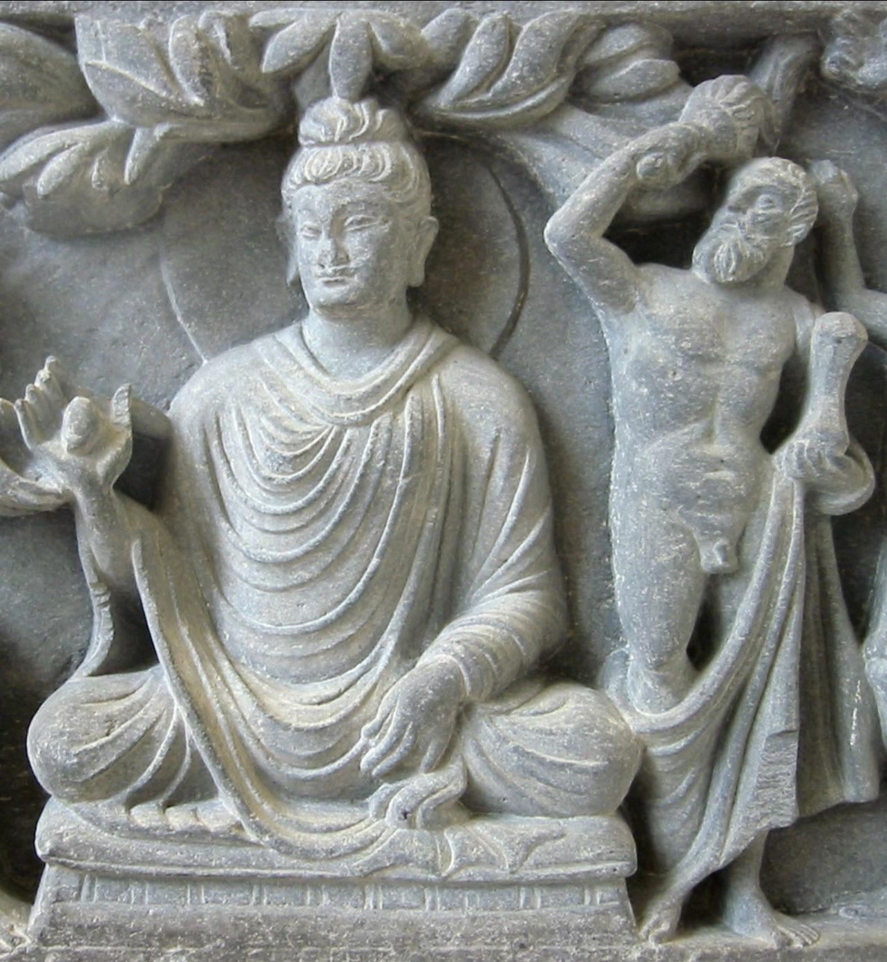 Panel showing the Buddha performing a miracle before ascetics. Kushan period, in modern-day Pakistan and Afghanistan 2ndC-3rdC. At his side is his protector Vajrapāṇi depicted as the Greek hero Hercules (Heracles), carrying his signature club.[1284×1393]