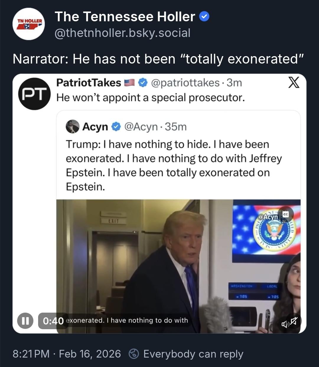 He is so exonerated on Epstein that we just need to move on and forget about all of this. Does anybody care the Dow hit 50k, the likes the world had not seen.