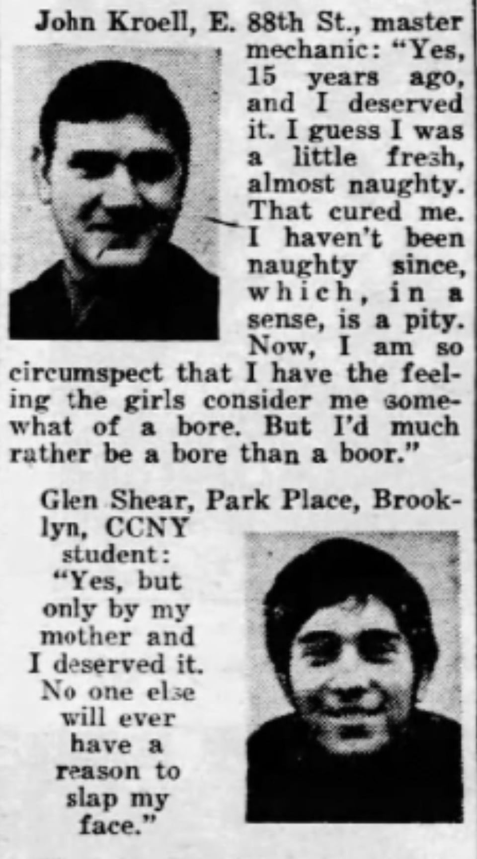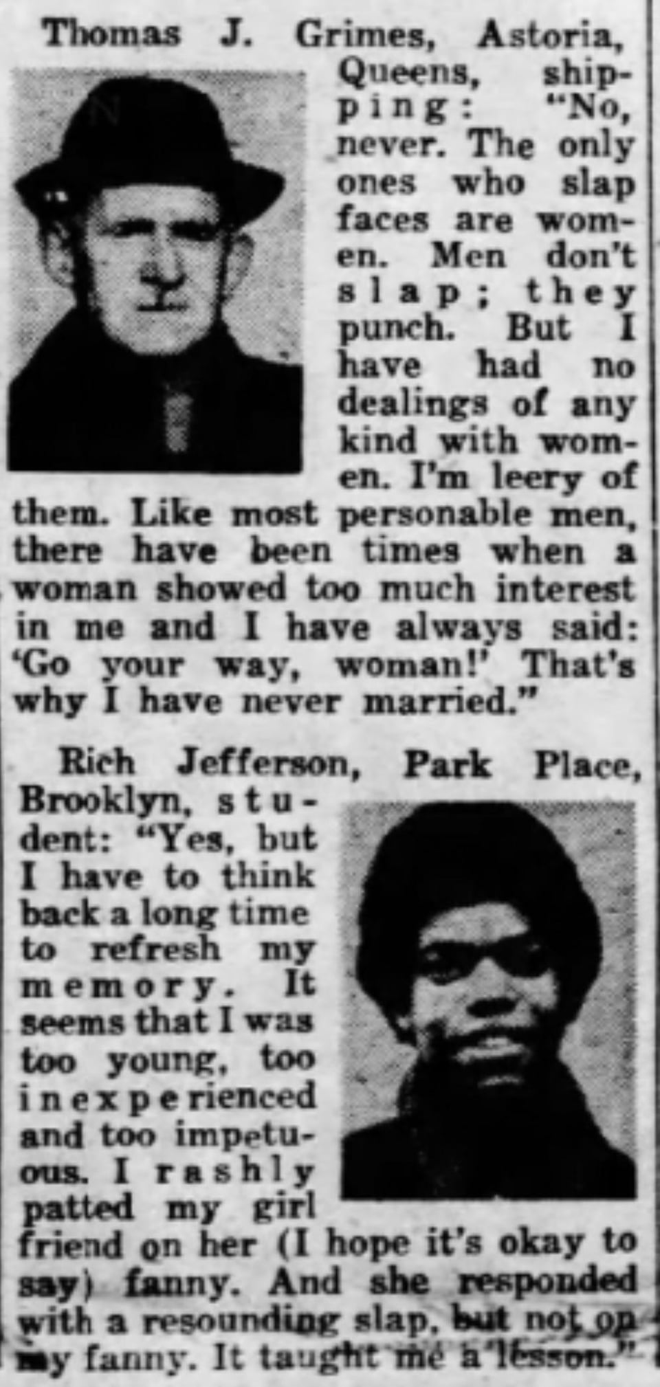 Inquiring Photographer:”Has a woman ever slapped your face? If so, did you deserve it?” January 12,1970.