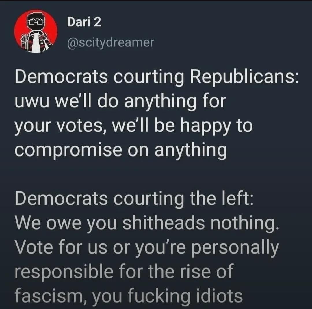 This post kinda demonstrates why the Democrats are like this. Democrats can’t really do much to appease the far left. Anything they do will never be good enough, short of a full socialist revolution.