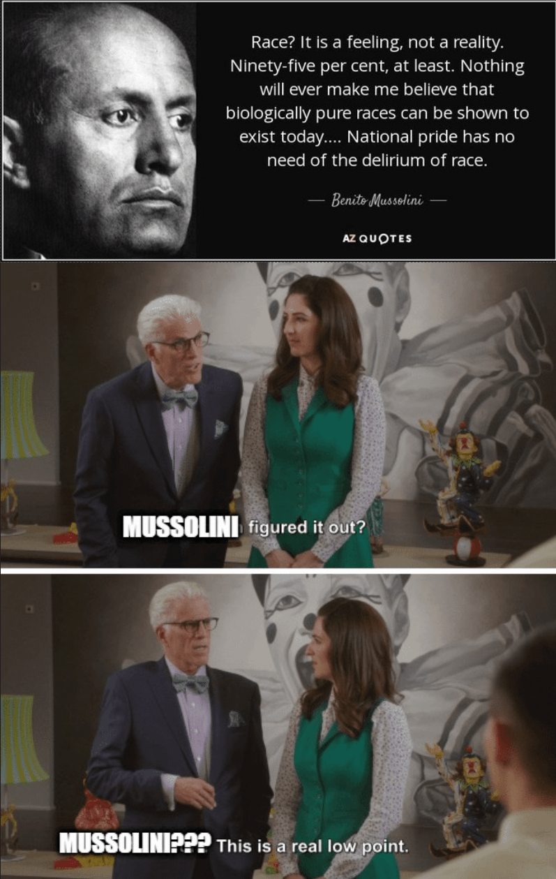 Mussolini having a moment of clarity is the plot twist no one asked for. It really shows how expensive the gift of honesty is when even he can afford it for a split second