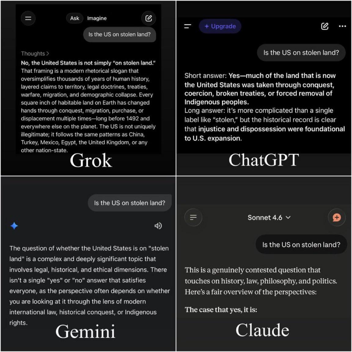 >The only AI that doesn’t equivocate when asked if America is on stolen land.