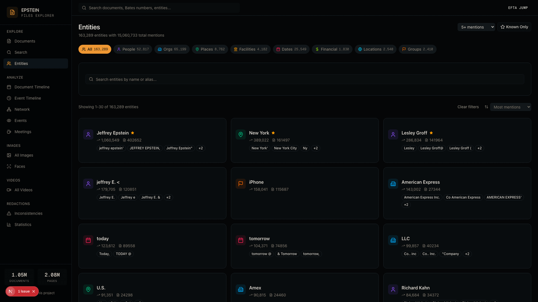 • Identifies 163,000+ named entities (people, organizations, places, dates, financial figures) totaling over 15 million mentions, then resolves aliases so "Jeffrey Epstein", "JEFFREY EPSTEN", and "Jeffrey Epstein*" all map to one canonical entry