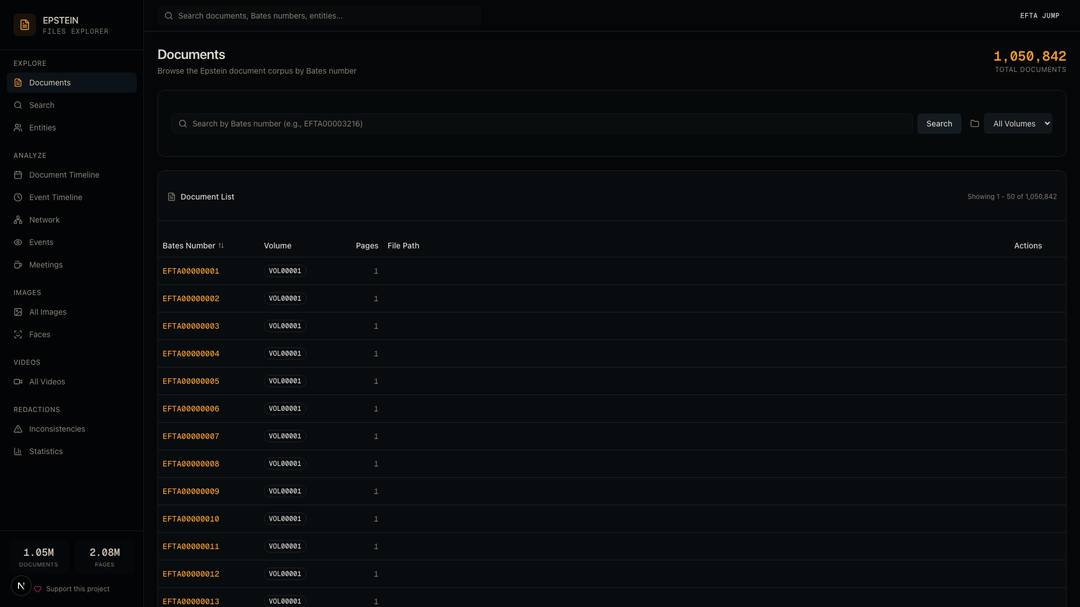 1. Documents — The main corpus browser. 1,050,842 documents searchable by Bates number and filterable by volume.